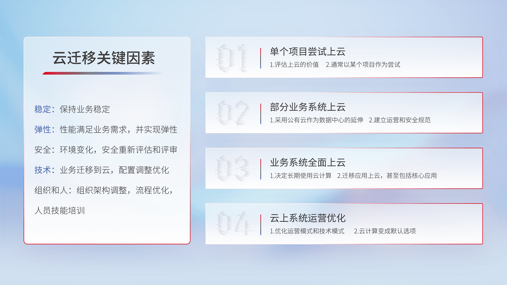 结合实际业务,,,,从规划设计、、、云平台选型、、、、云原生改造、、数据迁移、、、集成交付,,迁移全过程为客户识别最佳上云路径,,做好风险识别管理,,设计网络架构、、、、身份权限、、、、安全审计合规、、、操作审计、、、日志审计、、监控告警策略、、、、多站点容灾设计等,,,对云上基础设施进行整体规划,,,提升IT治理水平,,,,以满足弹性、、、、高可用、、高性能的需求。。。